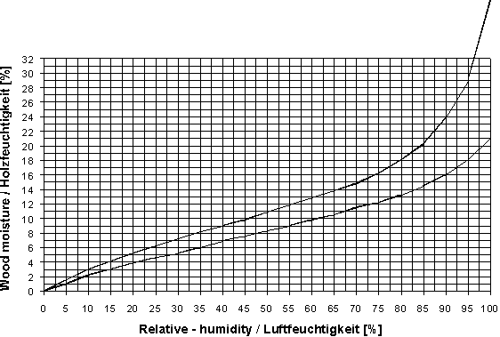 The moisture contained in wood depends on humidity. The moisture of most woodtypes is within the two curves in the diagram below.